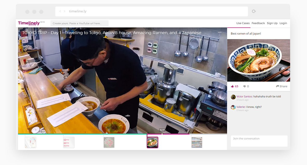 Timelinely makes it incredibly easy for you to drop in any YouTube URL, play it, pause it and instantly add a comment or media interaction, highlighting interesting or important moments in the video. React or just explain what's going on in the video.